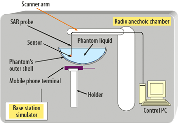 SAR is measured by filling phantom liquid that has the same electrical properties as those of the human body in a container made in the shape of the human body, and scanning the inside using an SAR probe. In consideration of the situation in which the mobile phone is actually used, we conduct measurements under a variety of conditions, determine maximum SAR, and make evaluations. The SAR measurement system is comprised of the following three items.