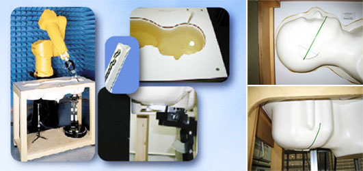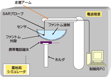 SARの測定は、人体と同じ電気的特性をもつファントム液剤を人体型の容器に入れ、その中をSARプローブで走査して行ないます。