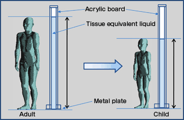 NICTで開発している液剤型人体等価アンテナは、液剤の高さを人体の身長に合わせて調整するため、大人および子供の足首誘導電流の評価が可能です。