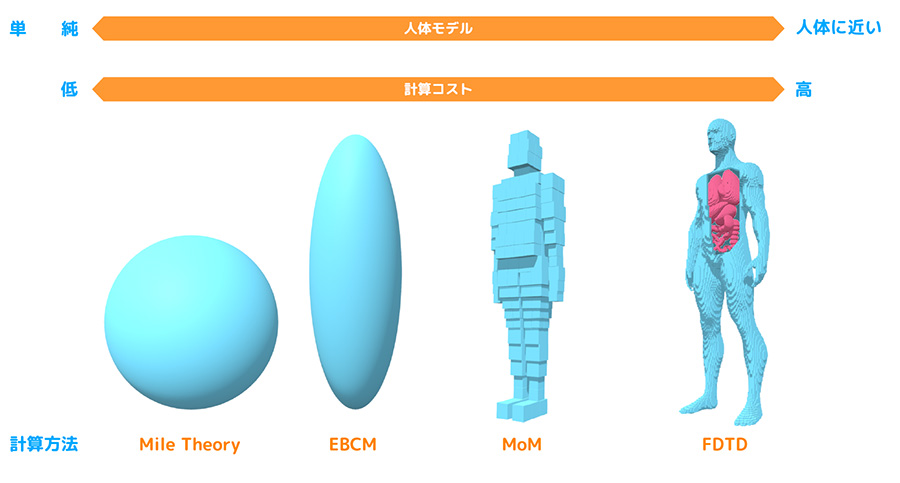 解剖学的構造を有した高分解能数値人体モデルや人体組織を簡易的に模擬したモデルを用いて、人体内部での電波の振る舞いや吸収量(SAR)を推定しています。