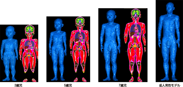 これらのモデルは日本人成人男女の平均身長と平均体重に合致したボランティアのMRIデータに基づき、2mmの空間分解能、51の組織・臓器を有しています。