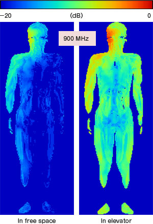 エレベーター内で携帯電話を使用した場合の人体内部のSARを解剖学的なモデルを利用して評価しています(携帯電話はダイポールアンテナと仮定)。